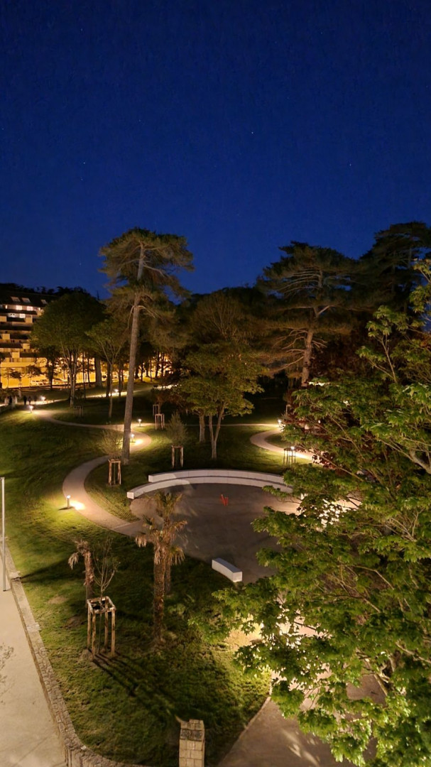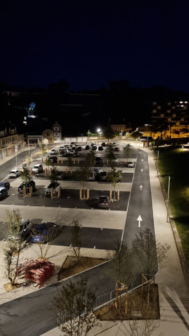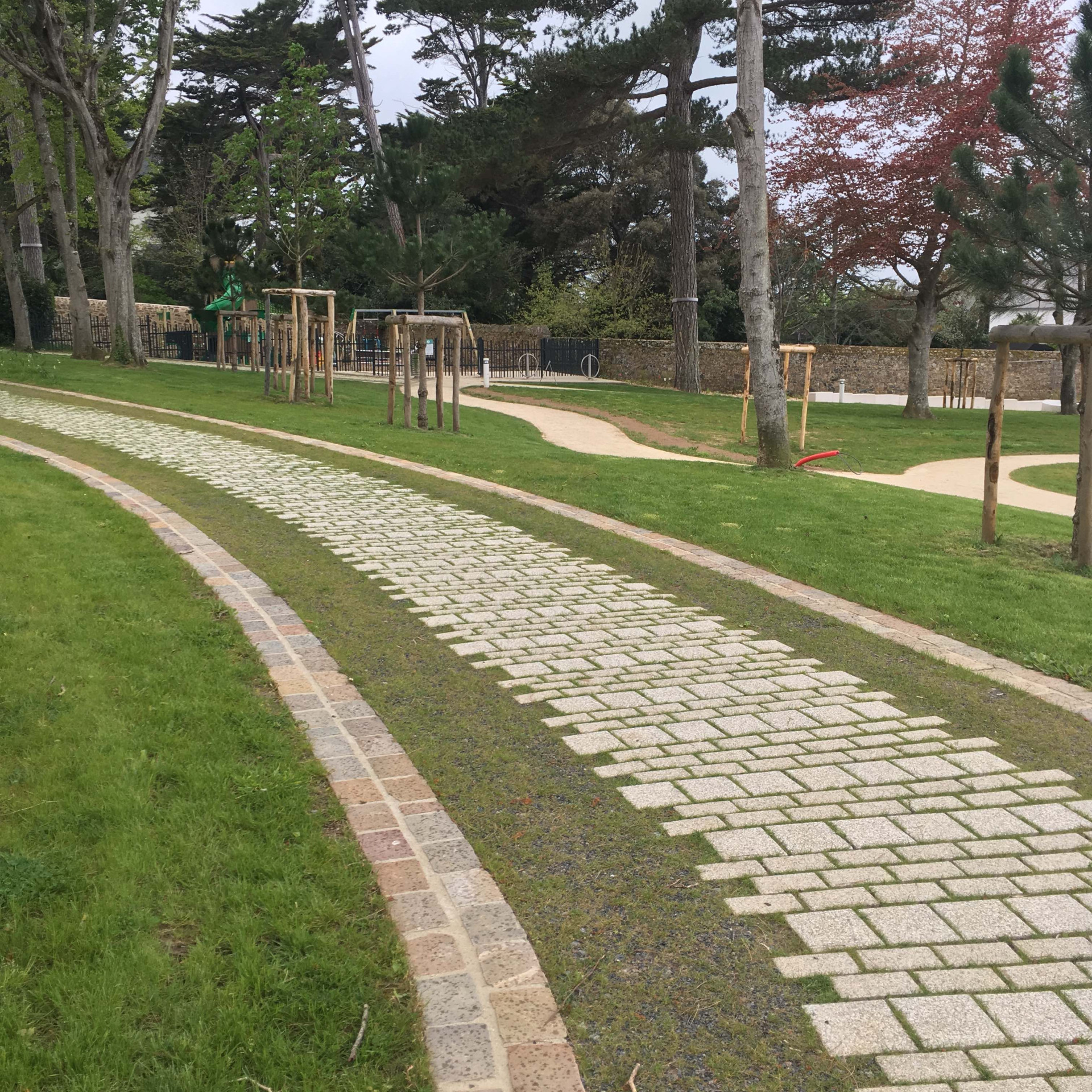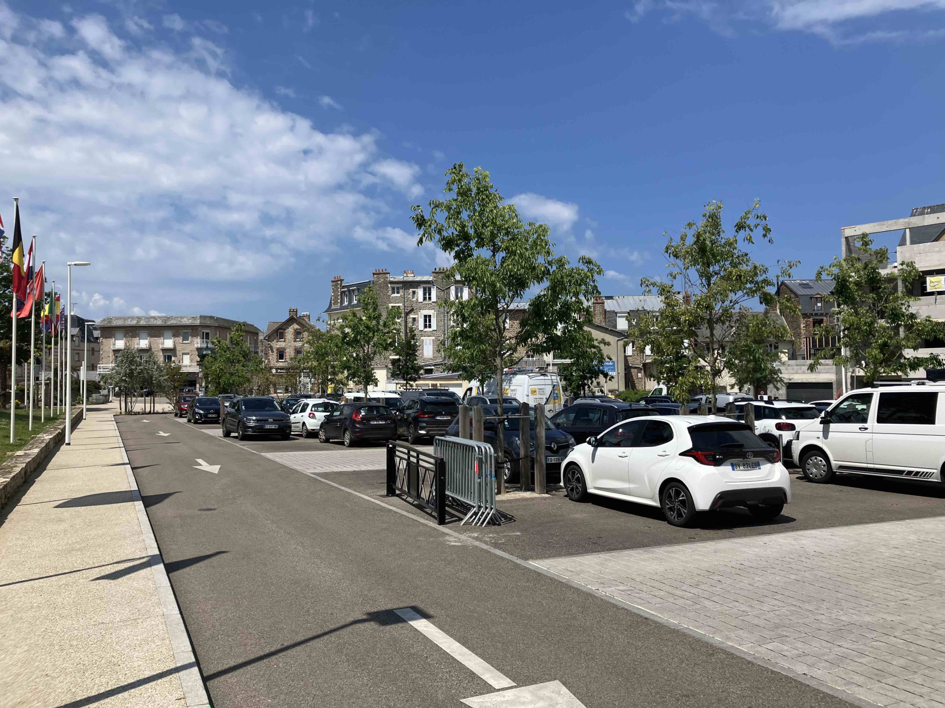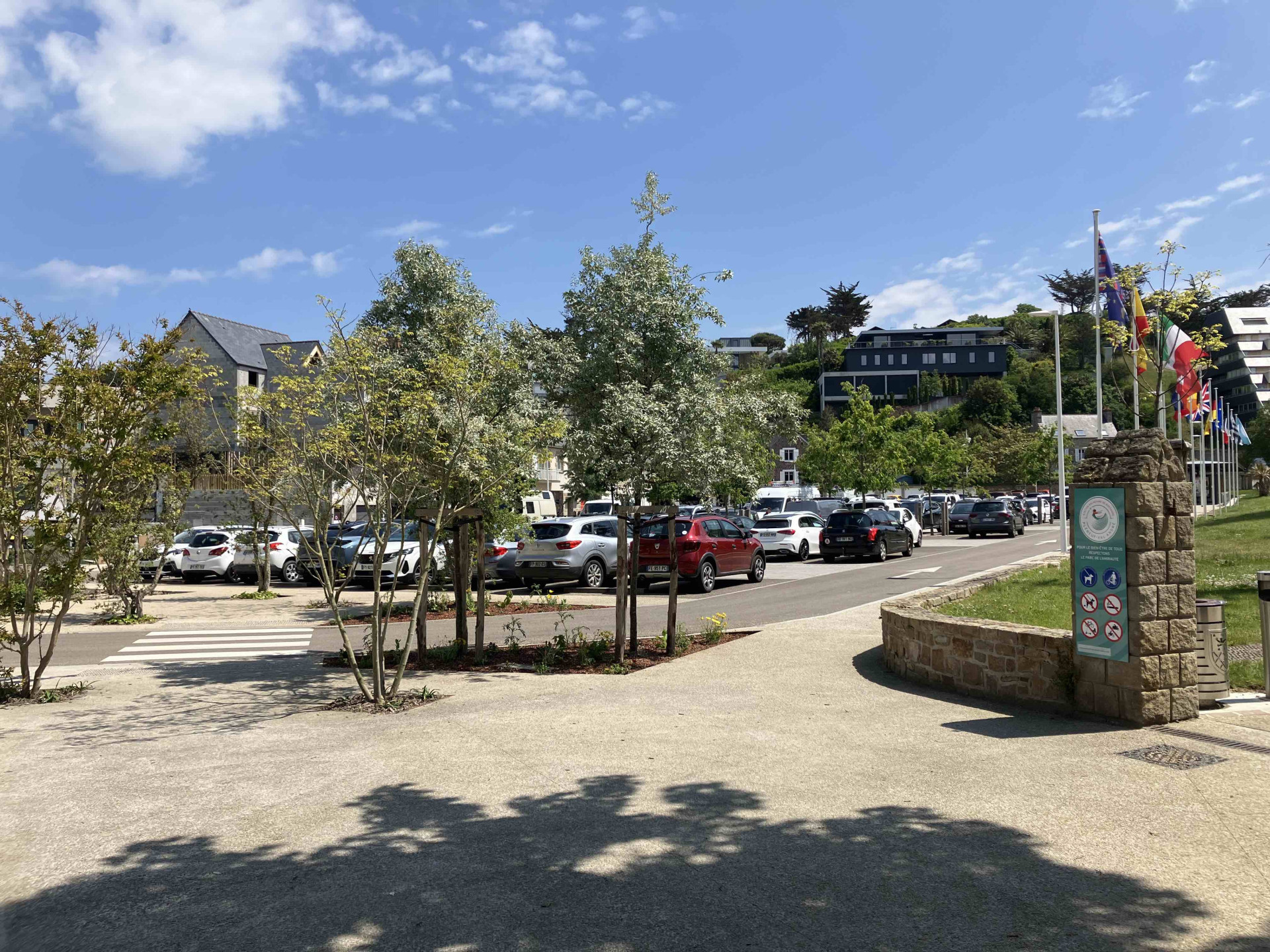 Au contact du parc de l'Amirauté, également rénové par Inermis, le parking central de la station du Val André qui fait également office de place de marché en période estivale, a profité d'un ré-aménagement en profondeur. La désimperméabilisation et la végétalisation ont transformé la physionomie des lieux, avec des nouvelles circulations, de nouvelles teintes et une optimisation des surfaces plantées. Un lien visuel et biologique est désormais créé entre le parc et ce qui était auparavant une vaste étendue d'asphalte.